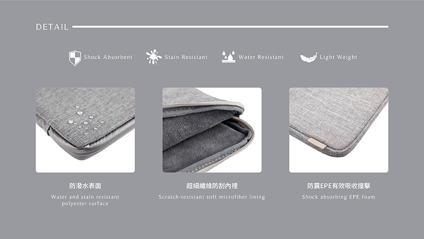 運用特殊材質處理,外層採用防水防污高質感布料,裡層加厚吸震EPE珍珠棉,防刮柔軟纖維內裡,打造整體防震環境,有效保護3C產品。