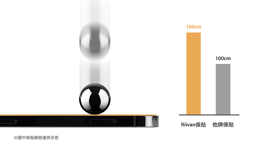 鐵球(64g)耐衝擊測試,Riivan保護貼能承受高於他牌保護貼50cm以上高度衝擊,相當於比一般玻璃保護貼高出1.5倍耐度。